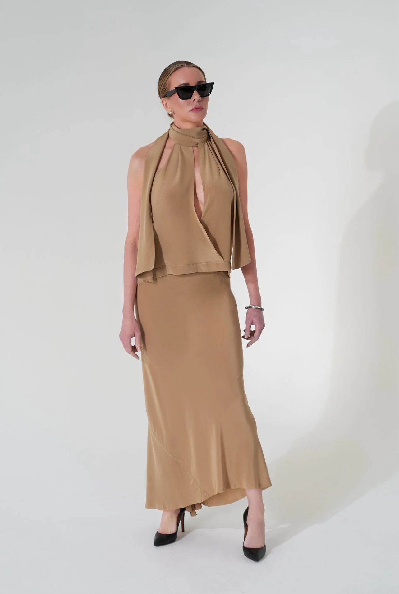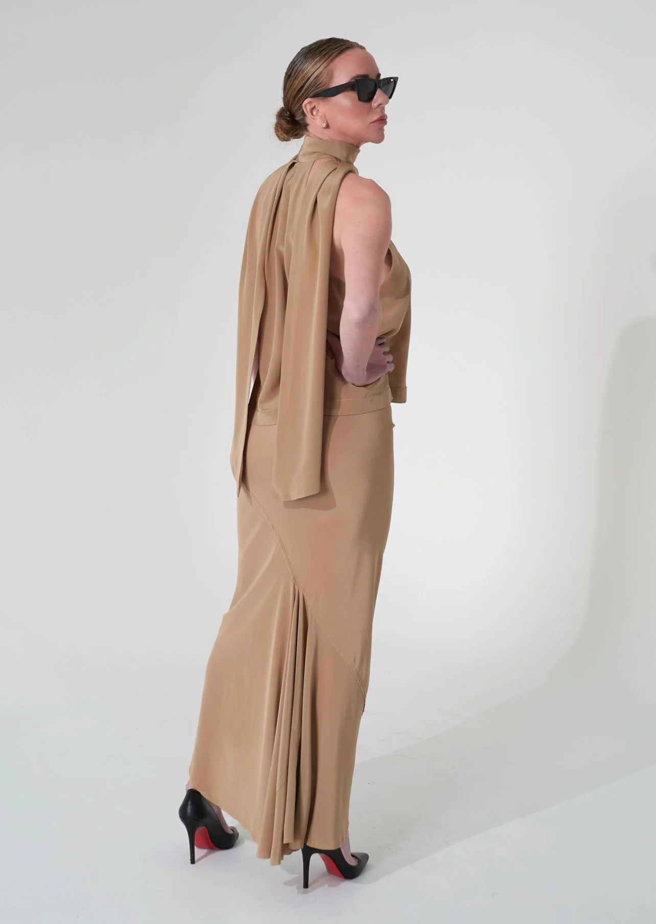 TIMELESS ELEGANCE AND A PERFECT FEELING ON THE SKIN COMPOSED THIS FLUID SILK AND LONG BIAS-CUT SKIRT. IT IS SHAPED TO A HIGH, WAIST AND FLARES INTO A DRAMATIC MERMAID TRAIN BACK . FITTED THROUGH THE WAIST AND HIPS, IT SKIMS THE BODY BEFORE FLOWING FROM AN ANKLE LENGTH FRONT HEM EXPRESSING THE ALEXANDER, MARGARITA, CRAFTMANSHIP AND SENSUALITY.